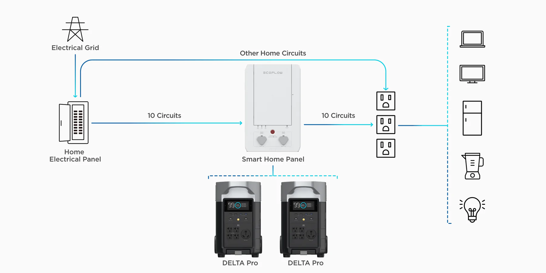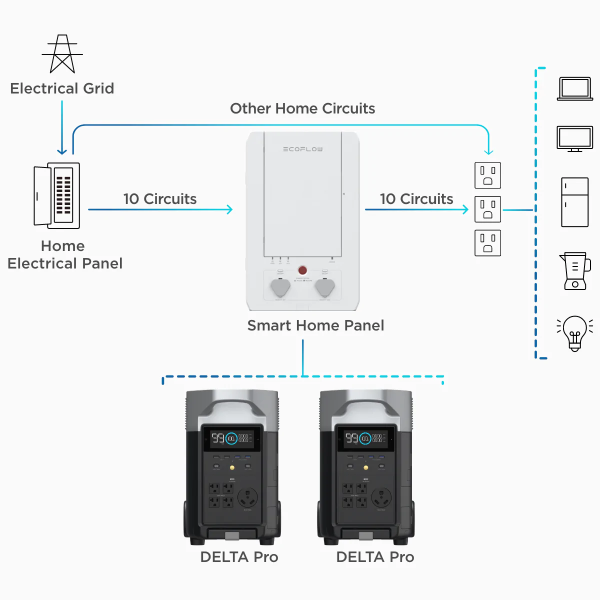 The new EcoFlow Smart Home Panel is the heart of the DELTA Pro home battery ecosystem. It integrates up to two DELTA Pro units with 10 home circuits. Each DELTA Pro can be connected with extra batteries, solar panels, or smart generators, giving you uninterrupted power during blackouts, smart energy management for your critical loads, and lower energy bills.